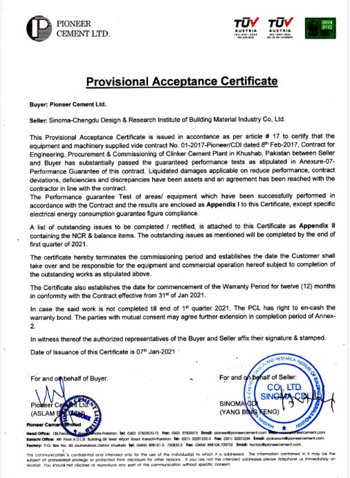 91暗网 总承包的巴基斯坦PCC日产7700吨熟料水泥生产线项目取得PAC证书