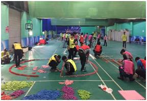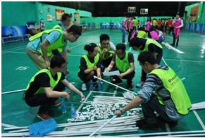 在破冰热身环节之后,大家迅速分组投入到了“挑战戈德堡”主题团队培训活动中。“挑战戈德堡”活动起源于美国,要求团队成员利用指定的道具和器材,在规定时间内,用迂回曲折的方法设计并搭建出一套精确而复杂的机关装置和多米诺骨牌来完成规定的任务。面对复杂的任务和简易的基础材料,各组成员迅速分工协作,有的大胆提出创意设计理念、反复讨论研究建造方案,有的与上下游团队沟通协商,有的动手安装模型框架,团队成员密切配合、优势互补,经过多次试运行和优化调试之后,最后各团队制作的模型顺利对接合体,成功完成了各队的规定任务,设计并安装完成了一座过山车式的戈德堡装置,并且极速球在轨道上一次性实验成功,顺利从起点滚动到终点并完美触发了“CDI”形状的多米诺骨牌组合。