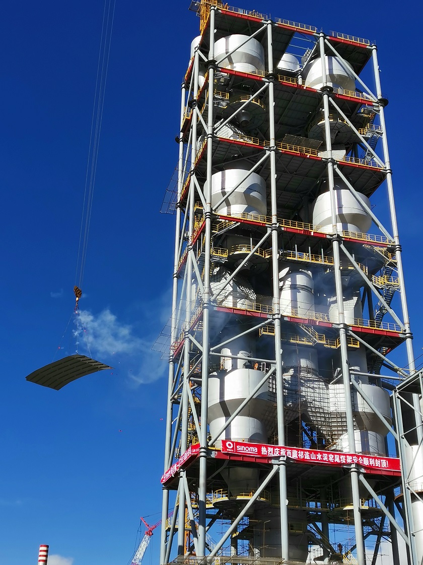 总承包的西藏中材祁连山年产120万吨熟料新型干法水泥生产线项目(以下简称“西藏祁连山项目”)窑尾预热器顶层平台最后一块钢板缓缓就位,预热器塔架顺利封顶,标志着项目主体工程进入安装高峰期。