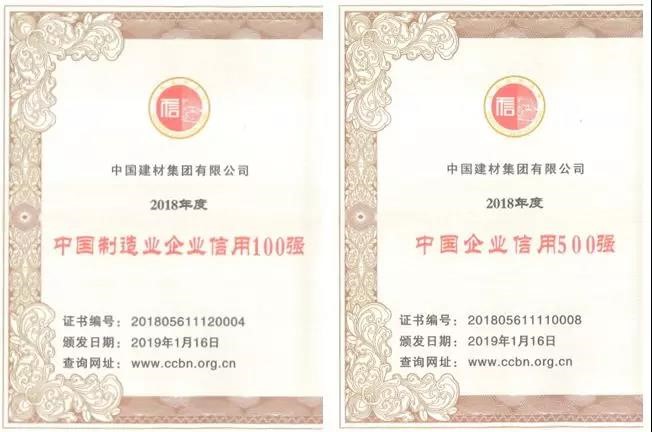 1月16日,由中国企业改革与发展研究会、中国合作贸易企业协会主办的“2019中国企业信用发展论坛暨第十届诚信公益盛典”在京隆重召开。会上发布2018年度“中国企业信用500强”“中国制造业企业信用100强”“中国服务业企业信用100强”和“中国企业综合信用指数”等榜单。中国建材集团与华为、格力电器、上海汽车等优秀企业一道入围中国企业信用500强和中国制造业企业信用100强,在两个榜单分别排名第八位和第四位。